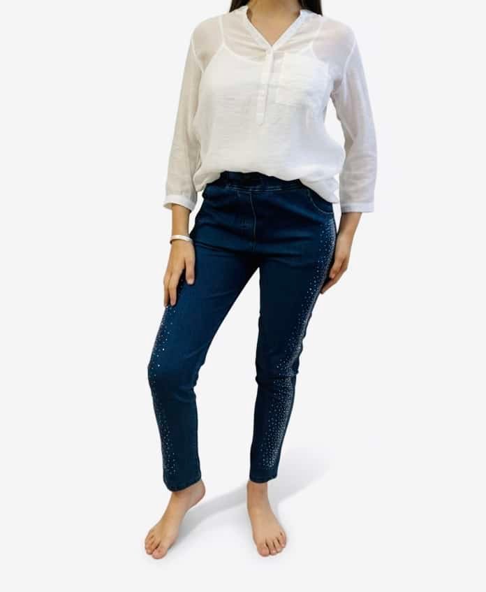 Jeans elasrizado con galón de brillos. Azul oscuro.